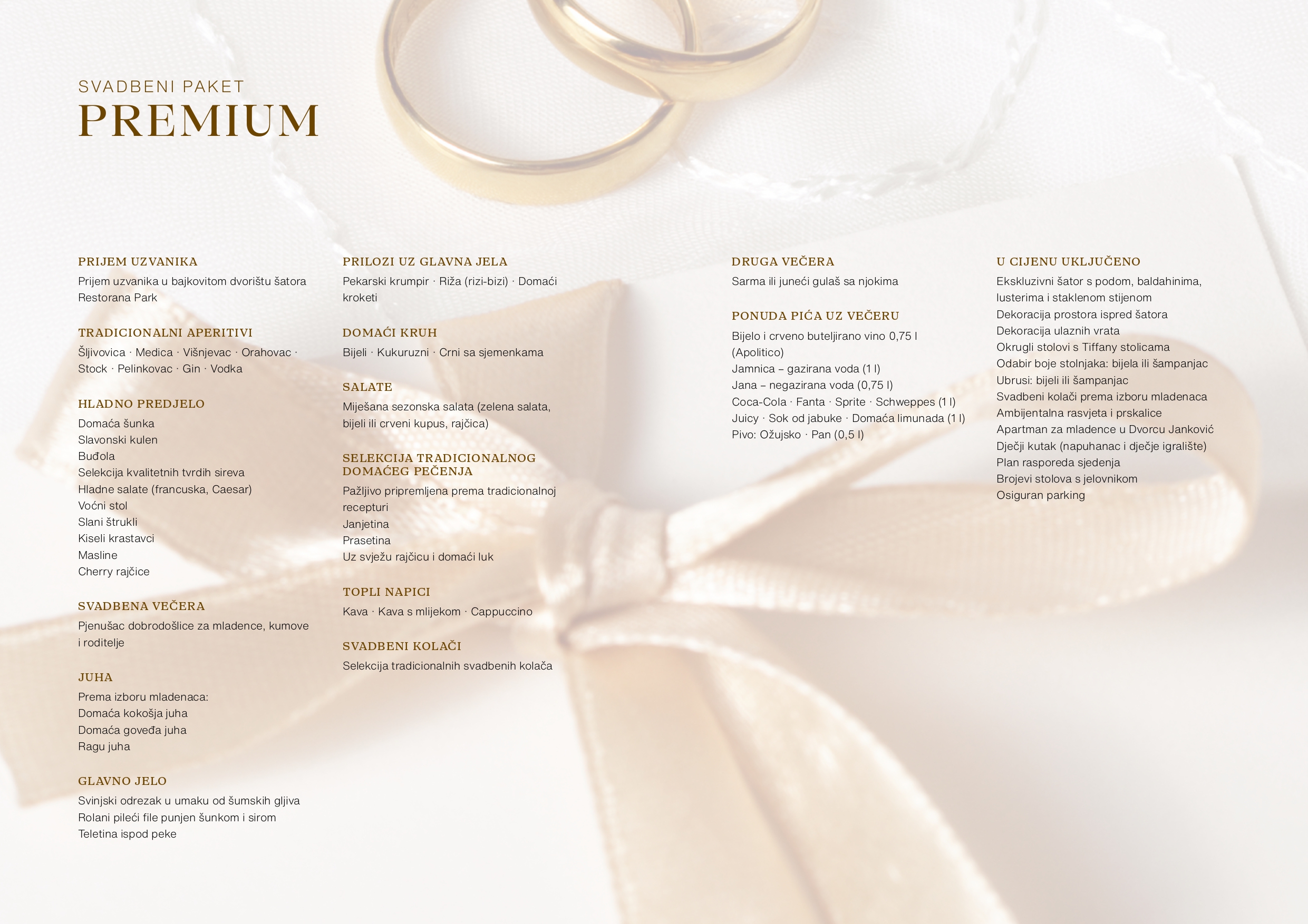 Uz pakete za veće proslave, osmislili smo i tri paketa za intimnija vjenčanja u svečanoj sali Restorana Park, kapaciteta do 100 uzvanika: Standard, Elegance i Royal.